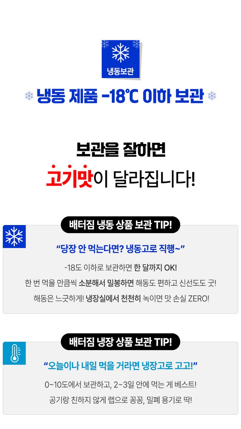 | 배송방법 | 신선/냉장/냉동 | 배송비 | 무료배송 · 도서산간 추가 배송비 - 제주 지역: 5,000원 - 도서산간 지역: 3,000원 |