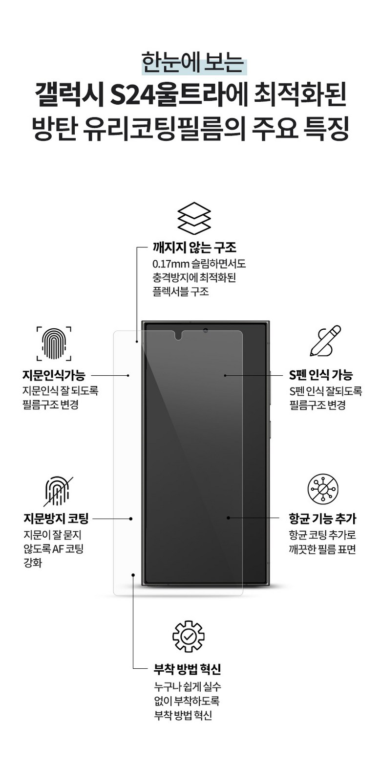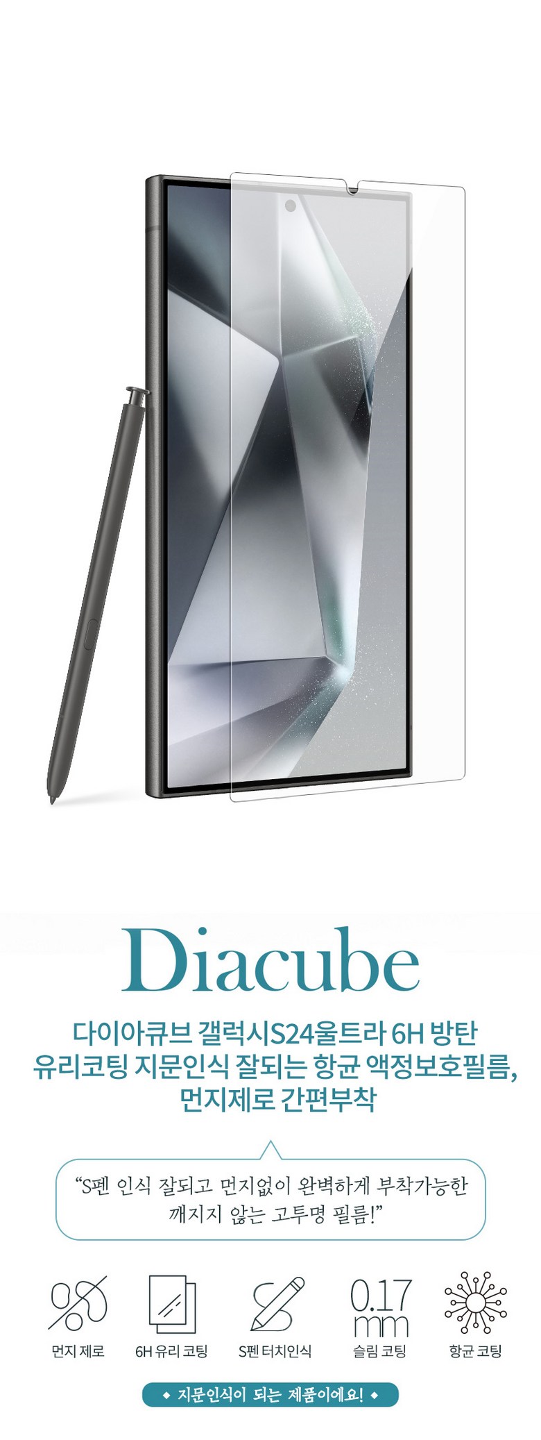 | 품명 및 모델명 | 다이아큐브 갤럭시S24울트라 6H방탄유리코팅 지문인식 잘되는 항균 액정보호필름, 간편부착 3개입 | 인증/허가 사항 | 알코올솜패드 안전기준 적합확인 신고번호: 제 HB20-02-0189호(한국환경산업기술원) |