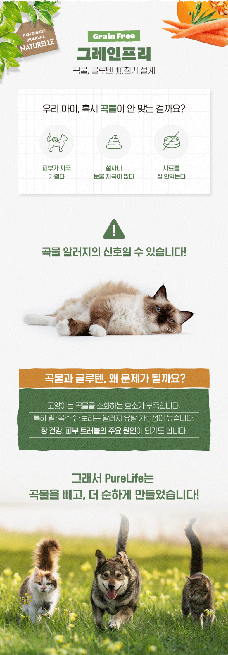 중성화 후 체중 관리가 필요한 고양이를 위한 저칼로리 그레인프리 사료입니다.