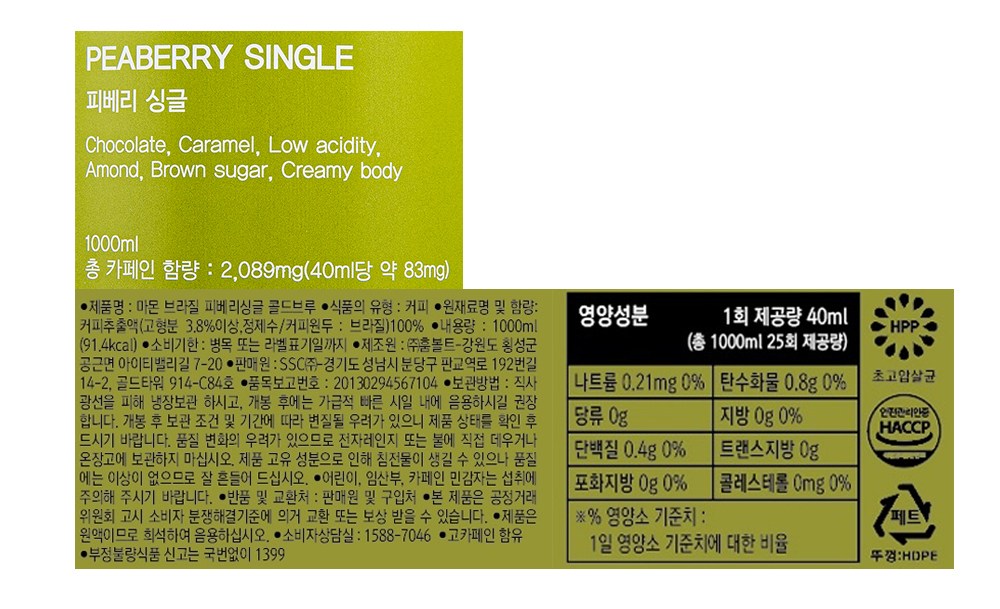 콜드브루는 원두 종류, 로스팅 방법 등에 따라 맛과 향이 참 다양한데요. 그중 진한 고소함과 은은한 단맛이 느껴지는 피베리 싱글 콜드브루 원액을 소개할게요. 쌉싸름한 맛에 비해 상대적으로 산미가 약한 것이 특징이에요. 취향에 따라 물이나 우유에 적당량 희석해 마셔보세요.