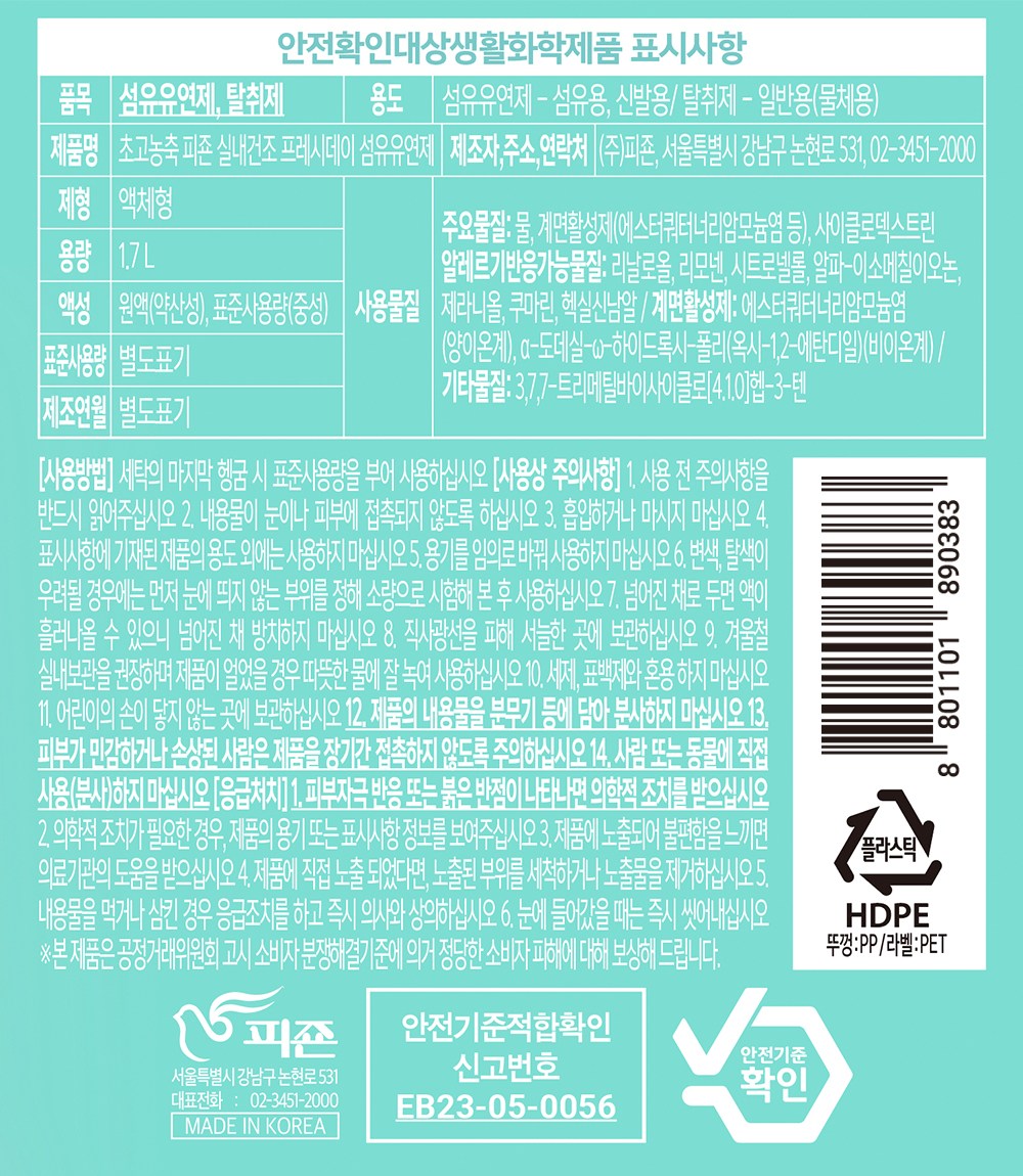 | 품목 및 제품명 | 섬유유연제,탈취제 / 초고농축 피죤 실내건조 프레시데이 섬유유연제 | 용도(표백제의 경우 계열을 함께표시) 및 제형 | 섬유유연제-섬유용,신발용/탈취제-일반용(물체용) / 액체형 |