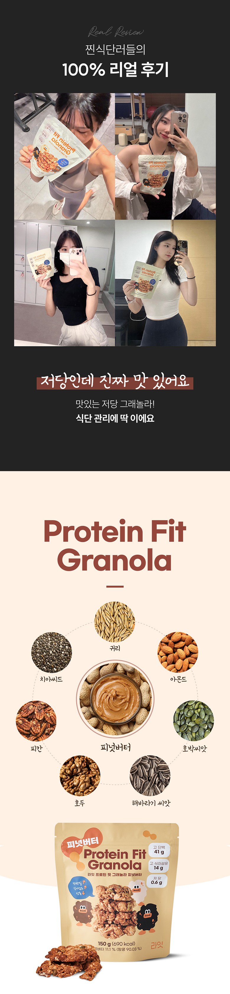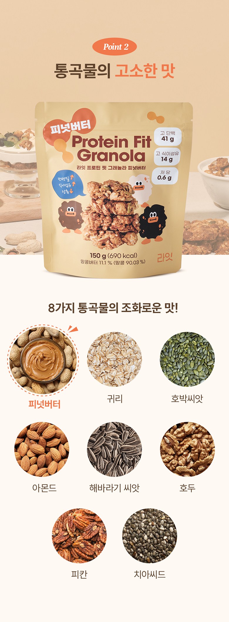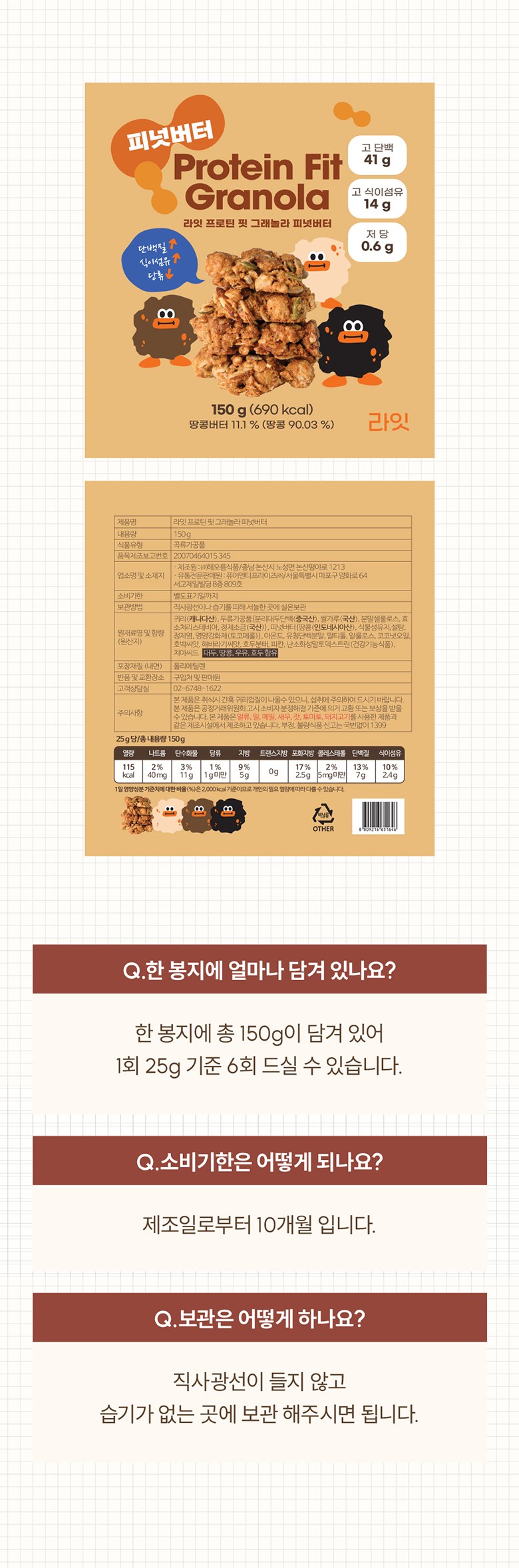 | 포장단위별 내용물의 용량(중량), 수량 | 150g | 원재료명 및 함량 | 귀리(캐나다산), 두류가공품{분리대두단백(중국산), 쌀가루(국산), 분말셀룰로스, 효소처리스테비아, 정제소금(국산)}, 피넛버터{땅콩(인도네시아산), 식물성유지, 설탕, 정제염, 영양강화제(토코페롤)}, 아몬드, 유청단백분말, 말티톨, 알룰로스, 코코넛오일, 호박씨앗, 해바라기씨앗, 호두분태, 피칸, 난소화성말토덱스트린(건강기능식품), 치아씨드 / 대두, 땅콩, 우유, 호두 함유 |
