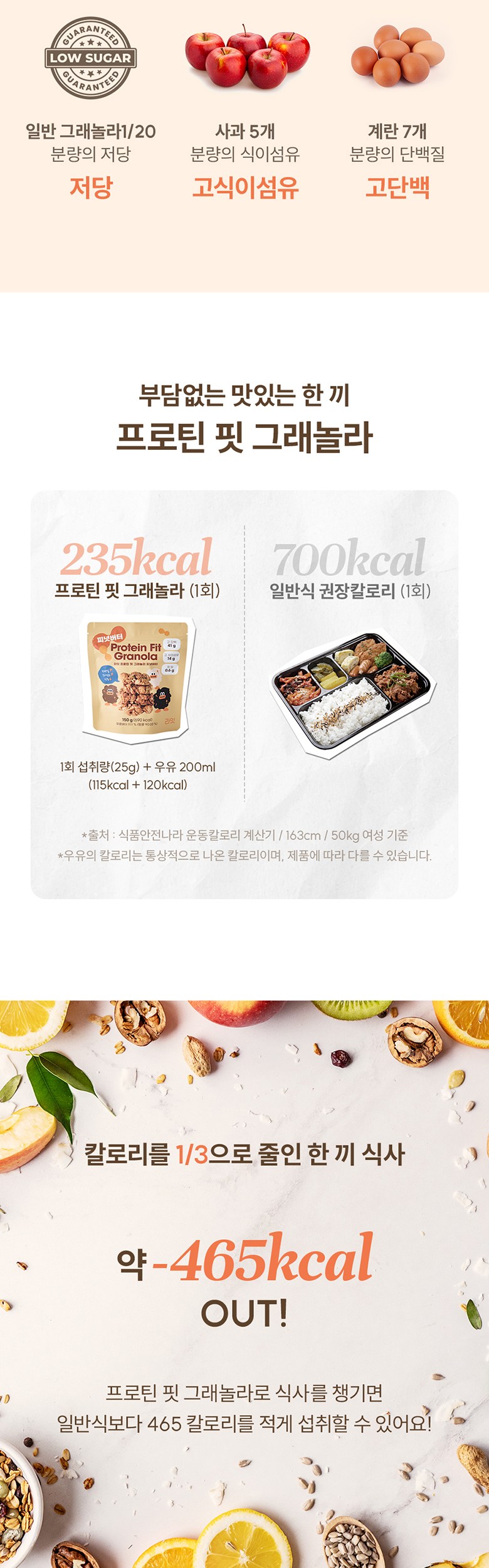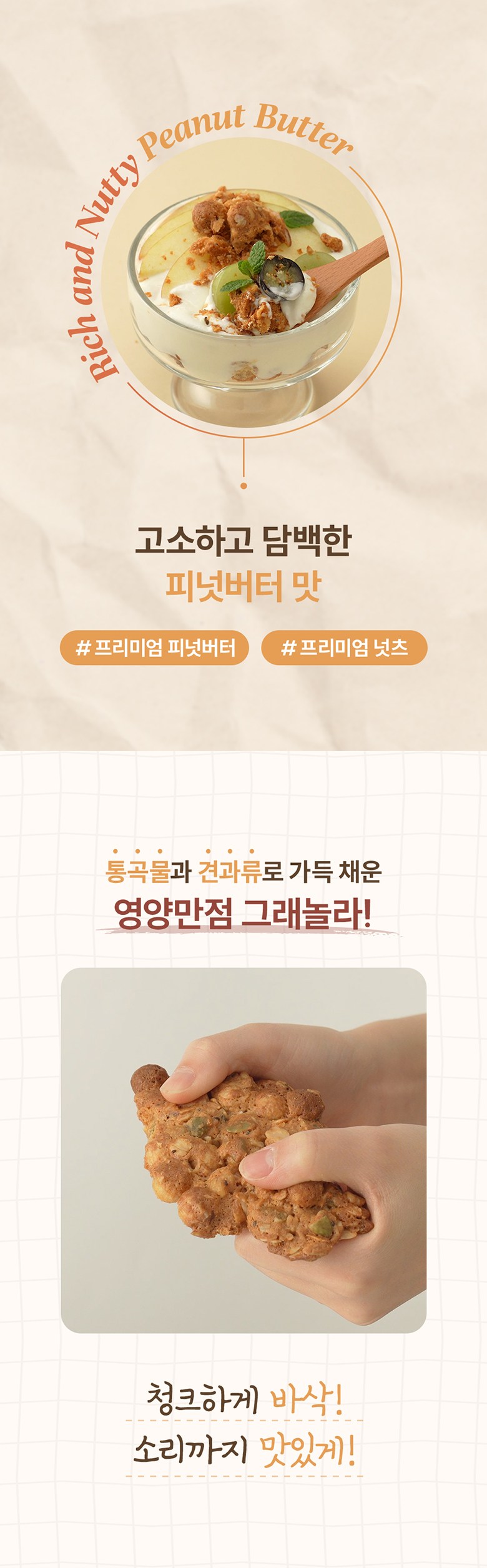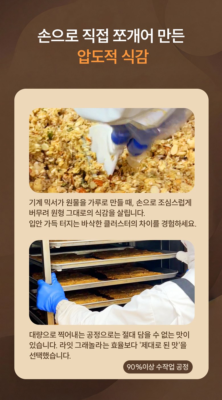 | 포장단위별 내용물의 용량(중량), 수량 | 150g | 원재료명 및 함량 | 귀리(캐나다산), 두류가공품{분리대두단백(중국산), 쌀가루(국산), 분말셀룰로스, 효소처리스테비아, 정제소금(국산)}, 피넛버터{땅콩(인도네시아산), 식물성유지, 설탕, 정제염, 영양강화제(토코페롤)}, 아몬드, 유청단백분말, 말티톨, 알룰로스, 코코넛오일, 호박씨앗, 해바라기씨앗, 호두분태, 피칸, 난소화성말토덱스트린(건강기능식품), 치아씨드 / 대두, 땅콩, 우유, 호두 함유 |