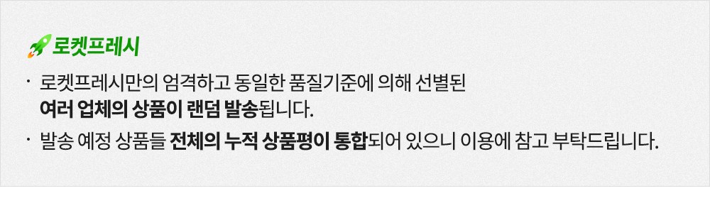 | 배송방법 | 신선/냉장/냉동 | 배송비 | 무료배송 - 로켓프레시 상품 중 15,000원 이상 구매 시 무료배송 - 해당 서비스 가능 지역에 한함 |