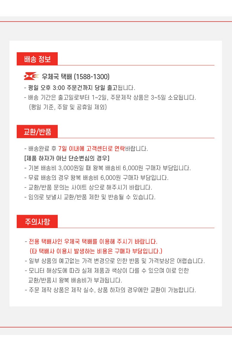 - ㆍ모니터 해상도의 차이로 인해 색상이나 이미지가 실제와 달라, 고객이 단순 변심으로 교환/반품을 무료로 요청하는 경우