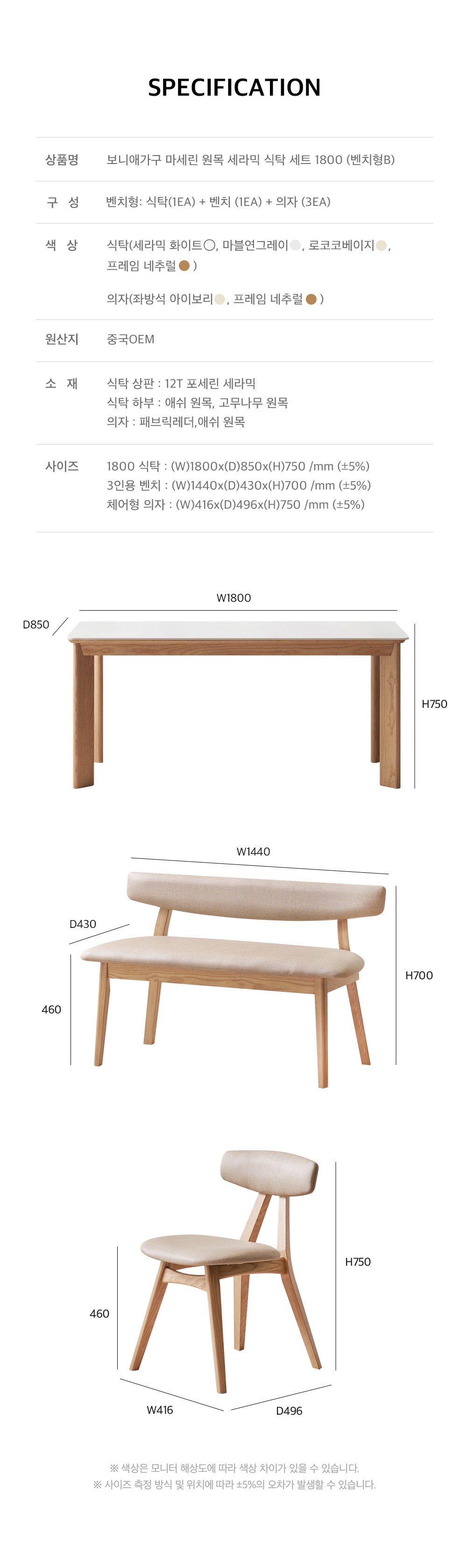 계좌이체- 사이즈: 식탁(1800 x 850 x 750 mm), 벤치(1440 x 430 x 700 mm), 의자(416 x 496 x 750 mm)