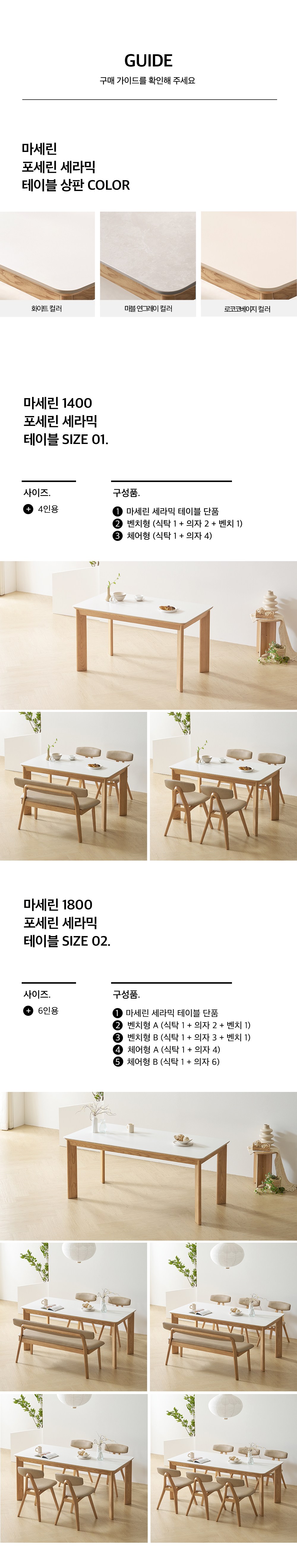 | 색상 | 식탁 : 화이트, 의자, 벤치 : 컨텐츠 참조 | 구성품 | 식탁 + 의자3P + 3인벤치1P |