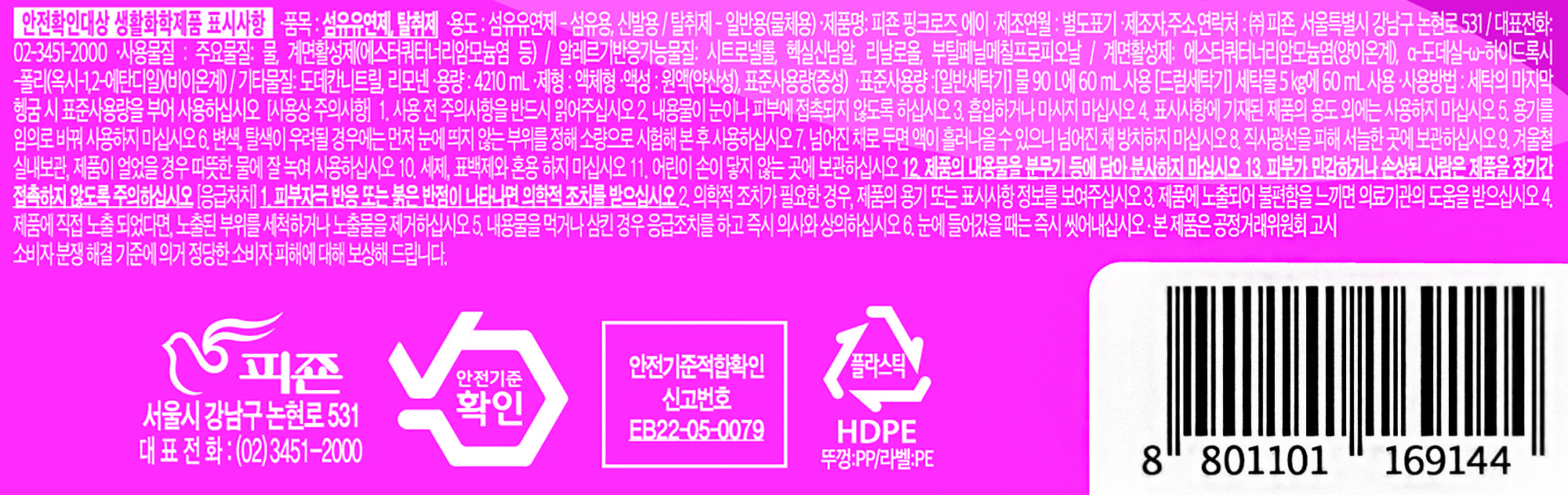 | 품목 및 제품명 | 섬유유연제, 탈취제 / 피죤 핑크로즈_에이 | 용도(표백제의 경우 계열을 함께표시) 및 제형 | 섬유유연제 -섬유용,신발용 / 탈취제 - 일반용(물체용)/ 보충형(액체형) |
