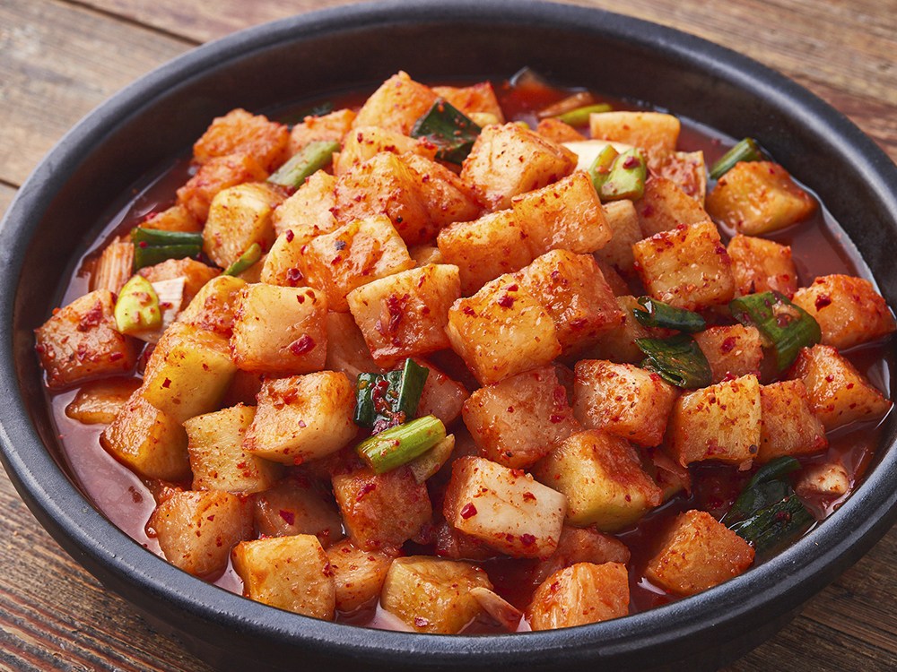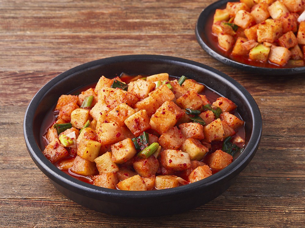 아삭아삭한 식감이 매력적인 깍두기예요. 한 입 먹어보면, 매콤하면서도 시원한 풍미가 입안 가득 터져 나오는데요. 육수로 낸 깊은 감칠맛도, 사이사이 씹히는 대파와 양파도 매력적이죠. 뜨끈한 국물과 함께할 밑반찬이 필요한 날 선택해보세요.