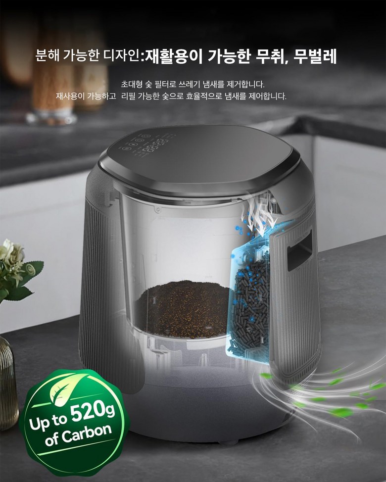 전원 공급 장치를 연결하려면 해당 콘센트에 전원 코드를 삽입하십시오. '삐' 소리가 들립니다. 기기를 켜려면 전원 버튼을 1초간 짧게 누릅니다. '삐' 소리가 들리고 기기가 대기 모드로 들어갑니다. 상부 커버를 열고 커버 열림 버튼을 누르면, 상부 커버가 잠금 해제됩니다. 음식물 쓰레기를 넣을 때에는 기기 내부통에 음식물 쓰레기를 부어주십시오. 내부의 통은 별도로 빼낼 수 있습니다. 음식물 쓰레기는 통 안쪽의 표시선까지만 넣으십시오. 상단 커버를 닫아주세요. '딸깍' 소리가 나면 상단 커버가 닫힌 것입니다. standard 또는 quick 버튼을 짧게 누르면, '삐' 소리가 나며 분쇄건조 모드로 진입합니다.