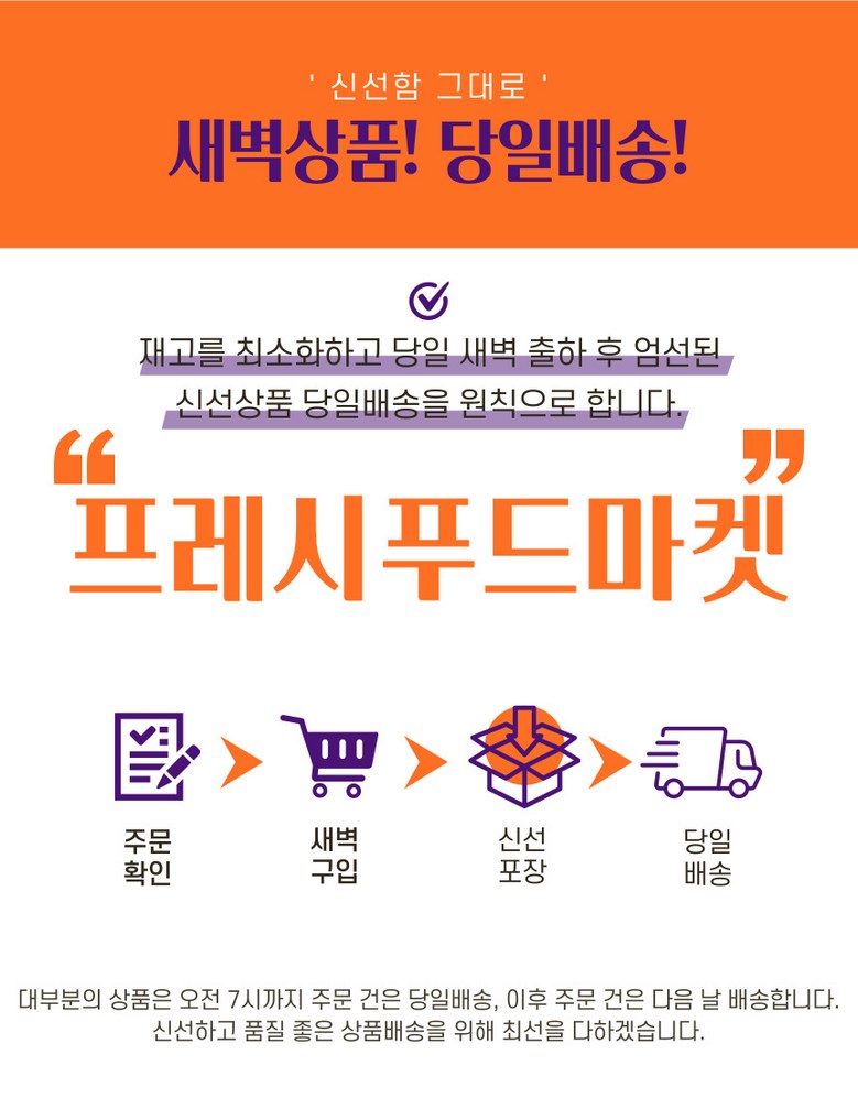 | 배송방법 | 신선/냉장/냉동 | 배송비 | 무료배송 · 도서산간 추가 배송비 - 제주 지역: 3,000원 - 도서산간 지역: 6,000원 |
