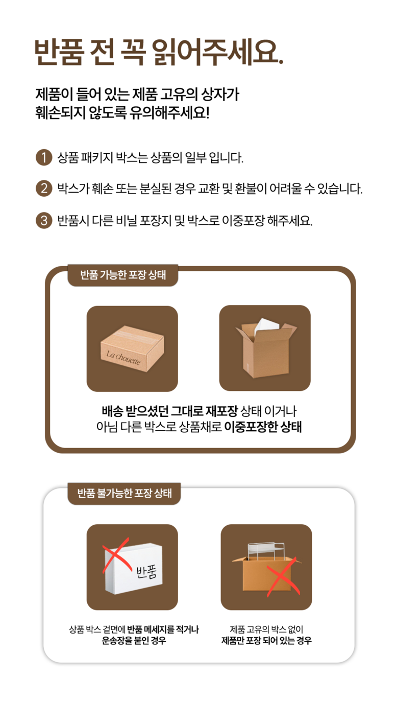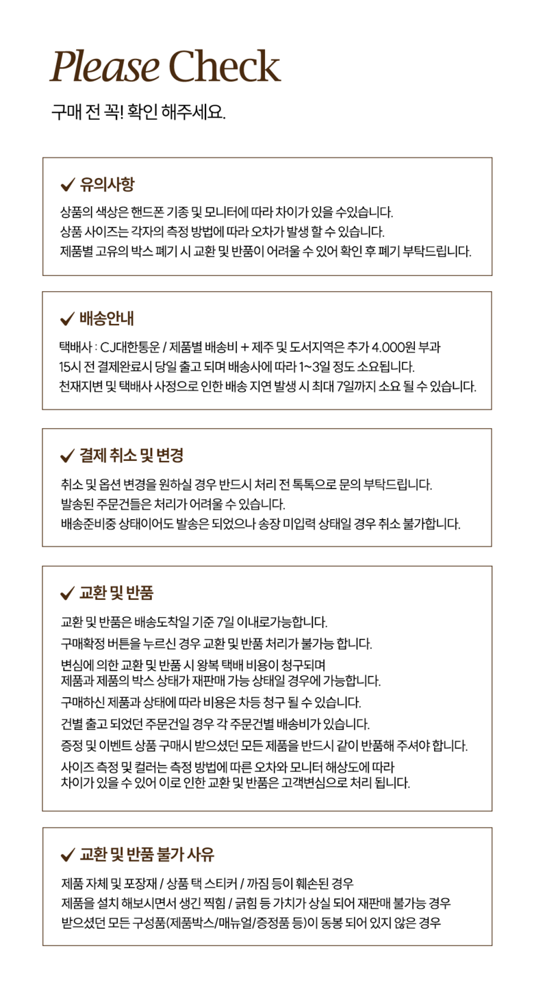 - ㆍ모니터 해상도의 차이로 인해 색상이나 이미지가 실제와 달라, 고객이 단순 변심으로 교환/반품을 무료로 요청하는 경우