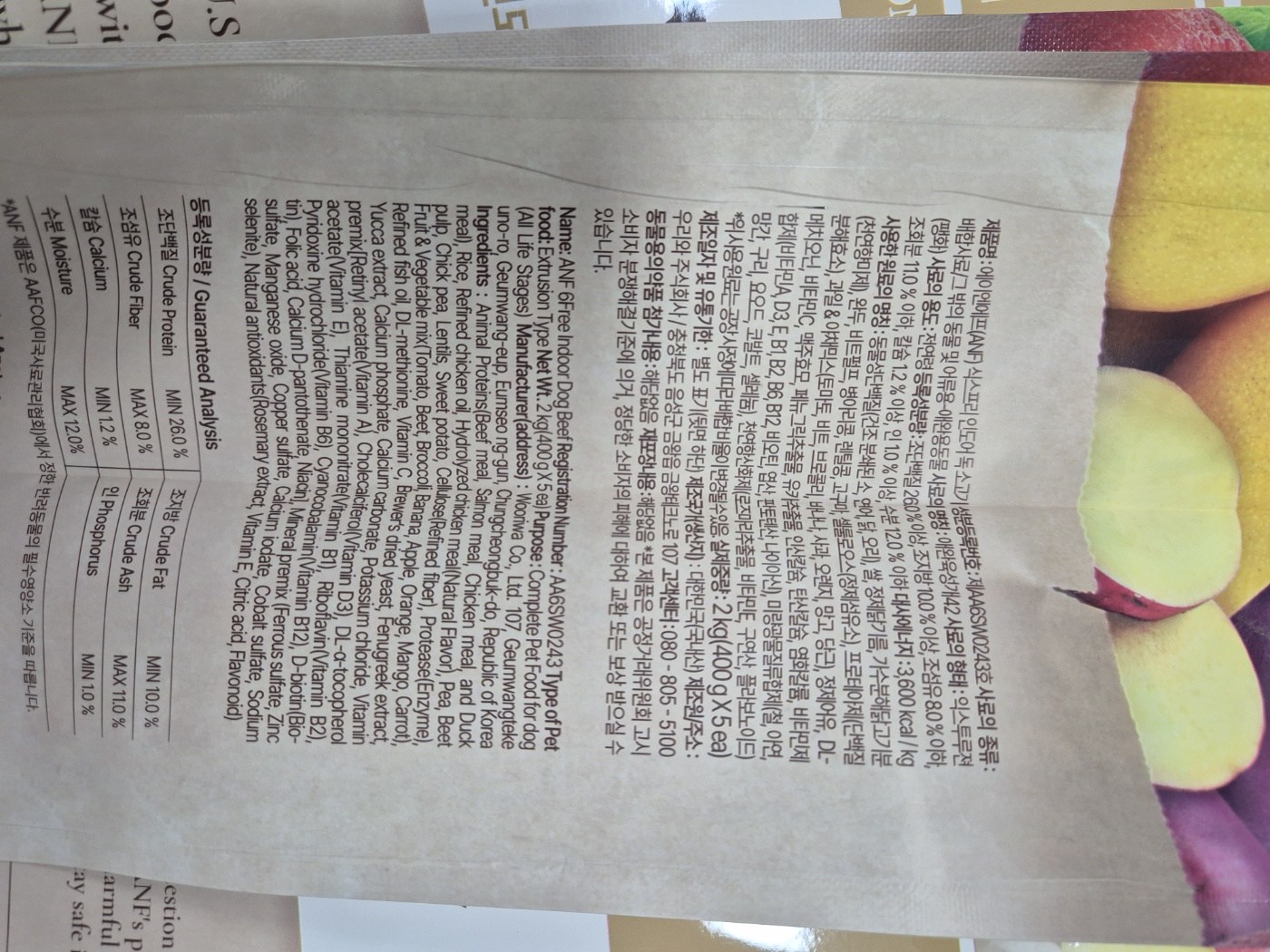 | 품명 및 모델명 | ANF 식스프리 인도어 독 소고기 | 인증/허가 사항 | 사료관리법에 따른 성분등록번호 : 컨텐츠 참조 |