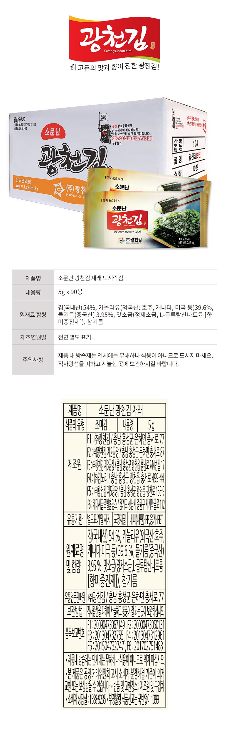 | 생산자 및 소재지 | ㈜광천김/충남 홍성군 은하면 충서로 77 | 제조연월일, 소비기한 또는 품질유지기한 | 업데이트 예정 |
