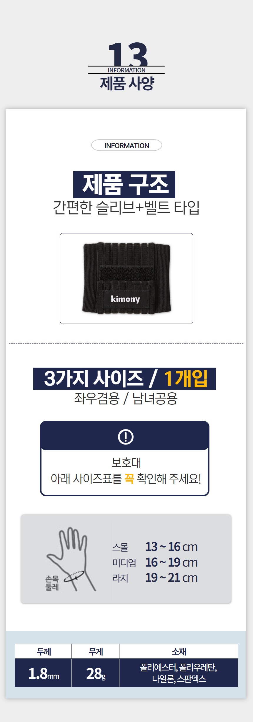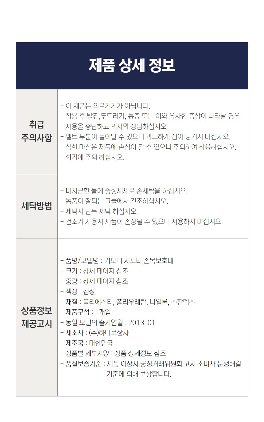 | 품명 및 모델명 | 키모니 손목보호대 KSP001 | KC 인증정보 | 해당없음 |
