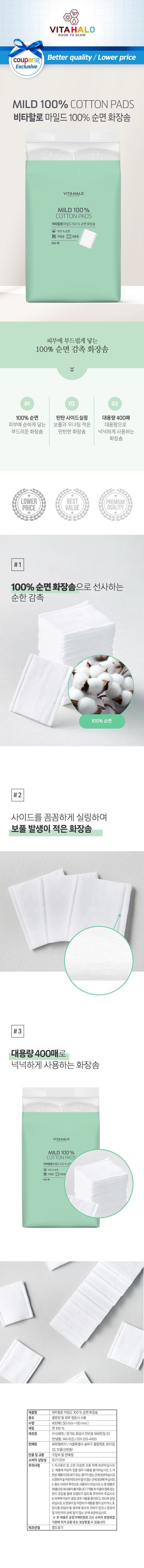 | 품명 및 모델명 | 비타할로 마일드 화장솜 400매 | 인증/허가 사항 | 해당사항없음 |