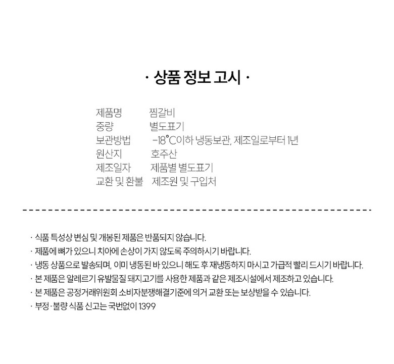| 품목 또는 명칭 | 소 찜갈비 | 포장단위별 내용물의 용량(중량),수량,크기 | 상품 상세페이지 참조 |