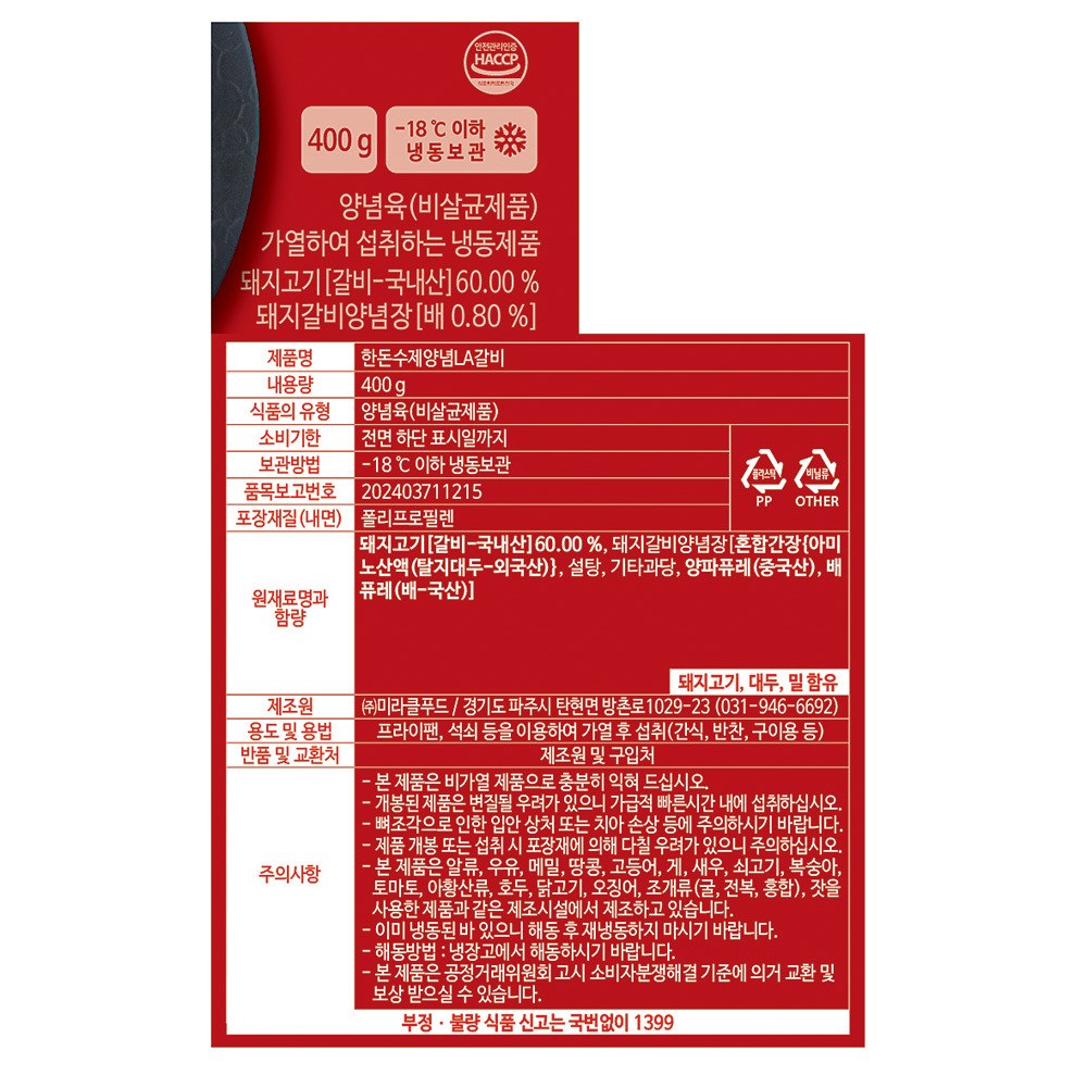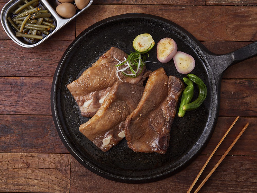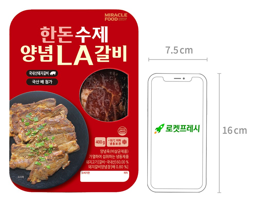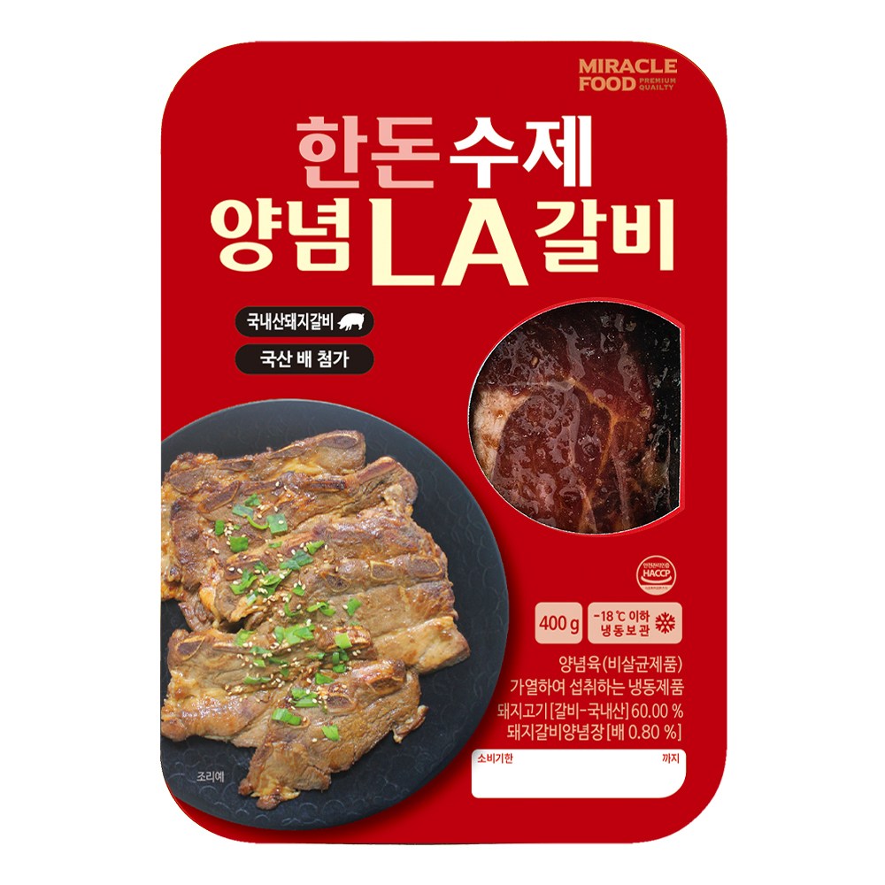 직접 재우려면 품이 많이 드는 양념 LA갈비. 이제는 간편하게 즐겨보세요. 돼지갈비를 양념장에 재워 달짝지근한 감칠맛이 살아있답니다. 별다른 양념을 할 필요 없이, 굽기만 하면 완성되니 간편해요. 뼈에 붙은 살코기까지 쫄깃쫄깃 뜯어 먹다 보면 밥 한 공기는 금방 비우게 될 거예요.