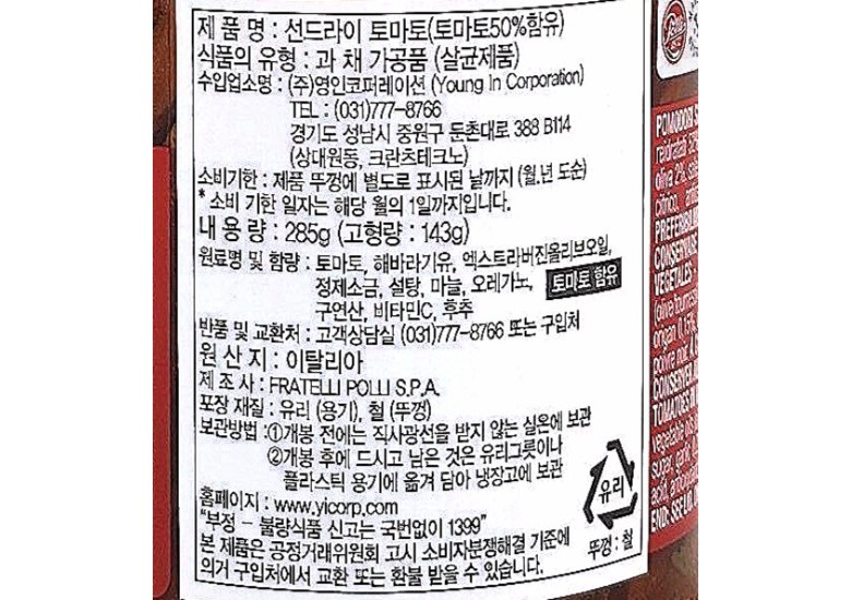 원료명 : 토마토, 해바라기유, 엑스트라버진 올리브오일, 정제소금, 설탕, 마늘, 오레가노, 구연산, 비타민C, 후추