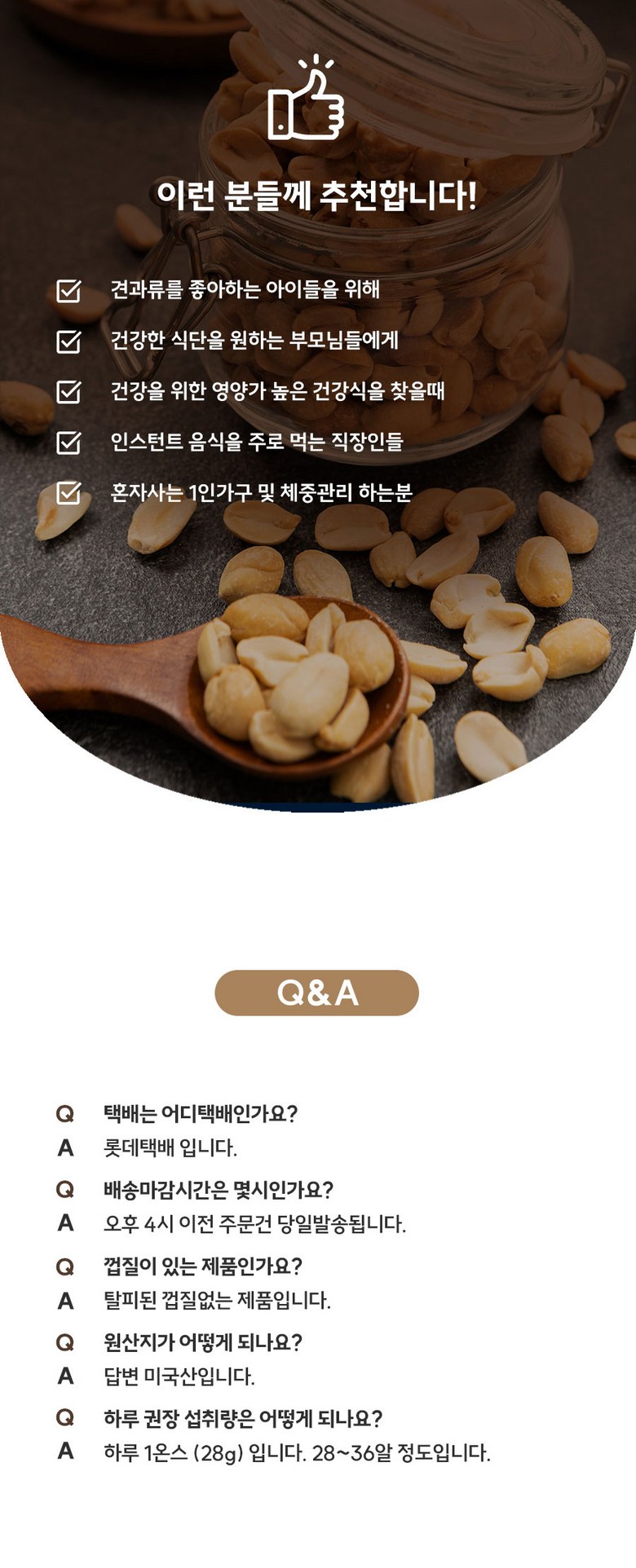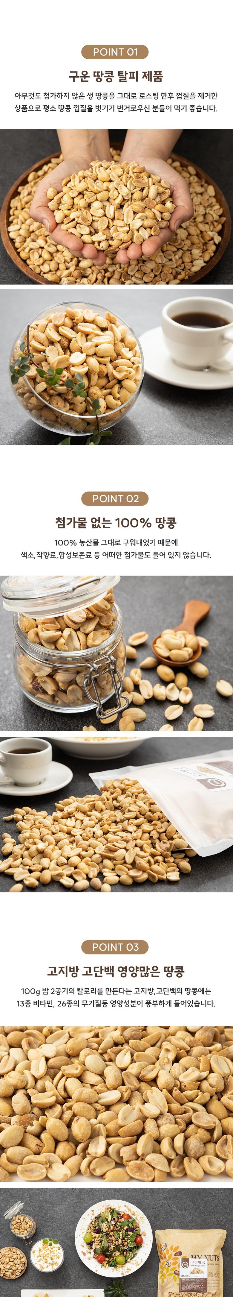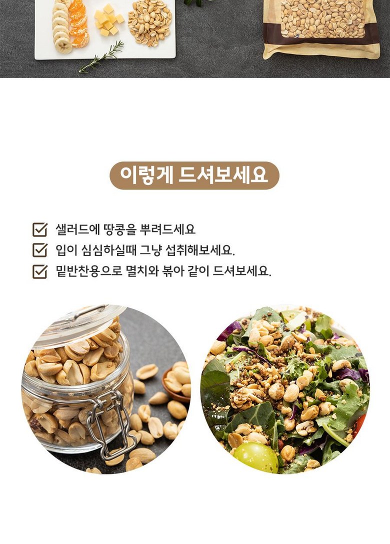 고온 로스팅으로 미국산 땅콩 특성상 부드러운 식감, 간단한 간식은 물론 맥주안주, 명절 선물, 캠핑 간식으로도 활용도가 높습니다.