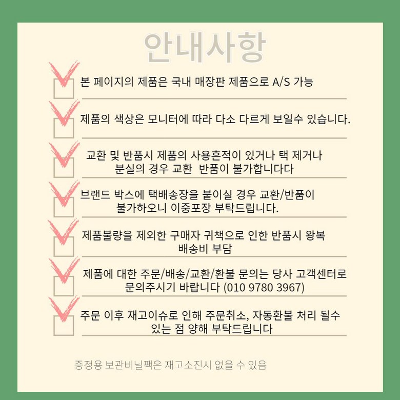 - ㆍ모니터 해상도의 차이로 인해 색상이나 이미지가 실제와 달라, 고객이 단순 변심으로 교환/반품을 무료로 요청하는 경우