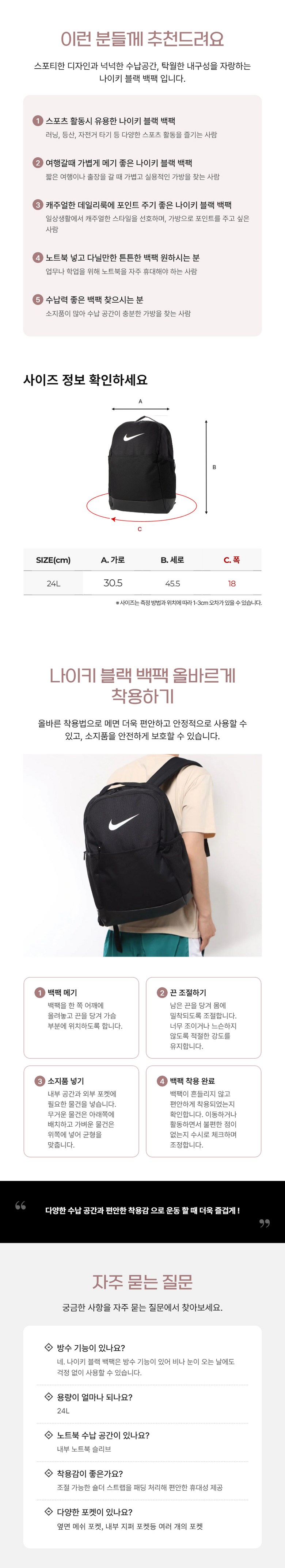 | 색상 | 블랙/블랙/화이트 | 크기 | Free (24L) 상세페이지 참조 |