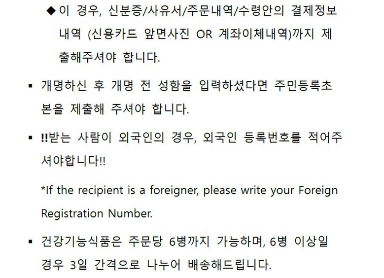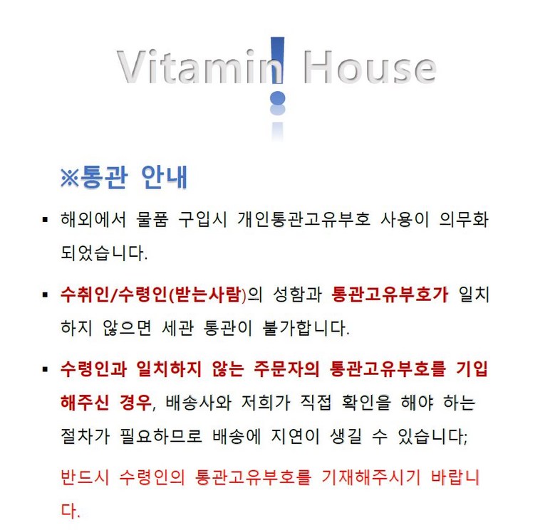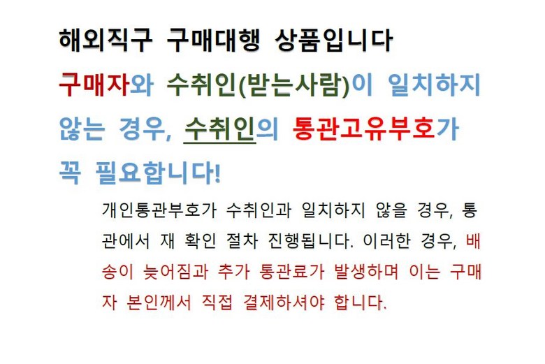- 법규 개정에 따라 개인통관고유부호 검증 절차가 강화되었습니다. 결제 단계에서 받는 사람의 정보가 관세청 등록 정보 (성명, 휴대폰, 개인통관고유부호, 주소) 와 일치하는지 확인해주세요.
