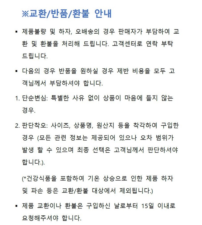 - ㆍ교환/반품에 관한 일반적인 사항은 판매자가 제시사항보다 관계법령이 우선합니다.