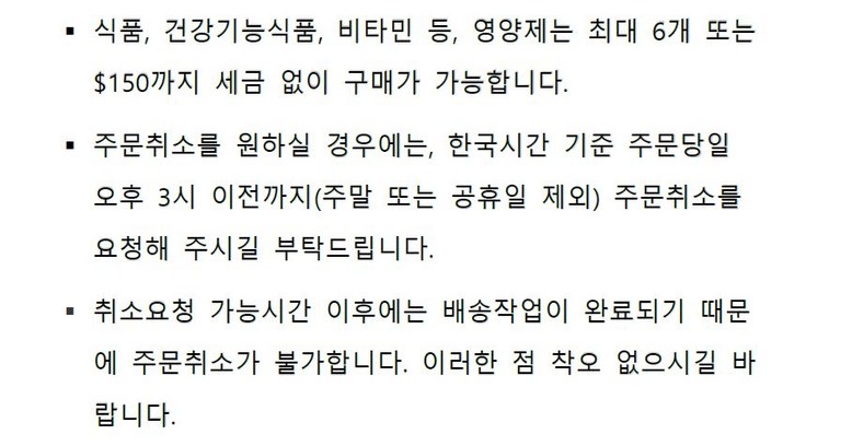 - 주문일 기준 동일 판매자 총 구매 금액이 면세 한도 초과 시 관부가세가 부과될 수 있습니다