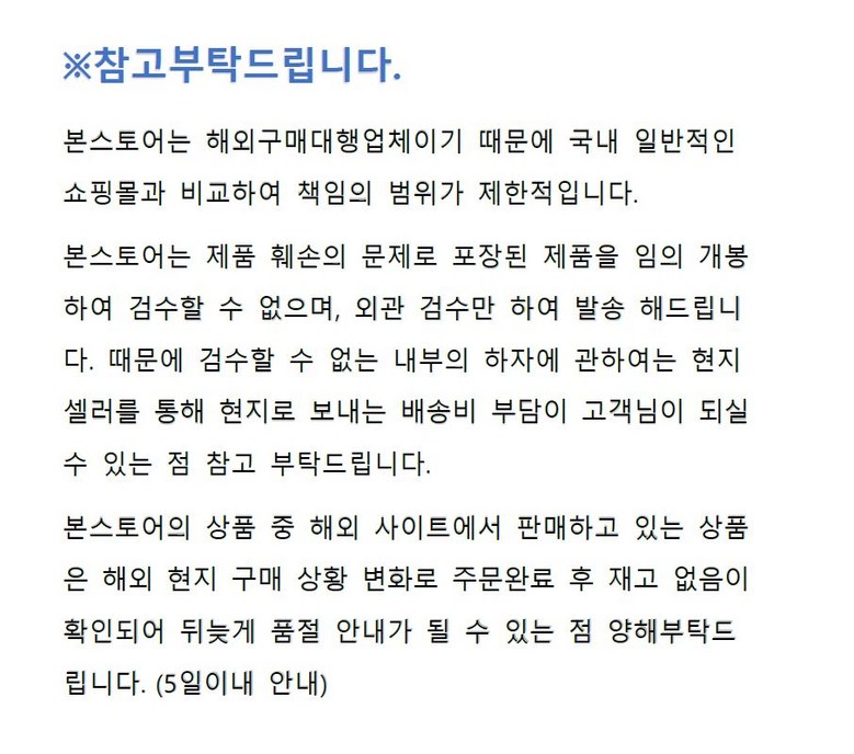 | 교환/반품 비용 (왕복비용) | 5,000원 - 단, 고객 변심의 경우에만 발생 - 도서산간 및 일부 지역 추가비용 발생 |