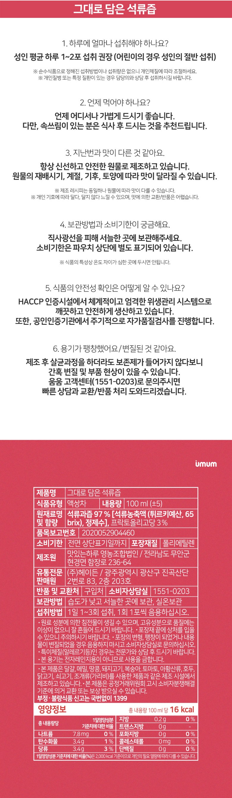 | 제품명 | 그대로 담은 석류즙 | 식품의 유형 | 액상차 |