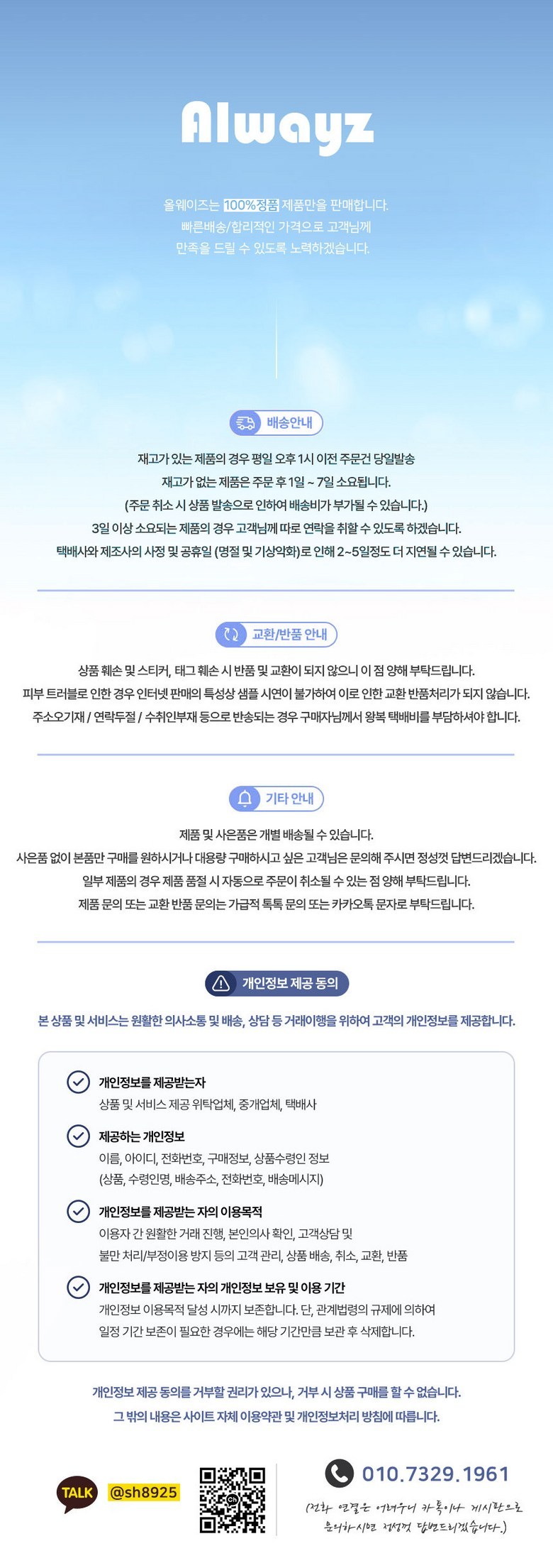 - ㆍ교환/반품에 관한 일반적인 사항은 판매자가 제시사항보다 관계법령이 우선합니다.