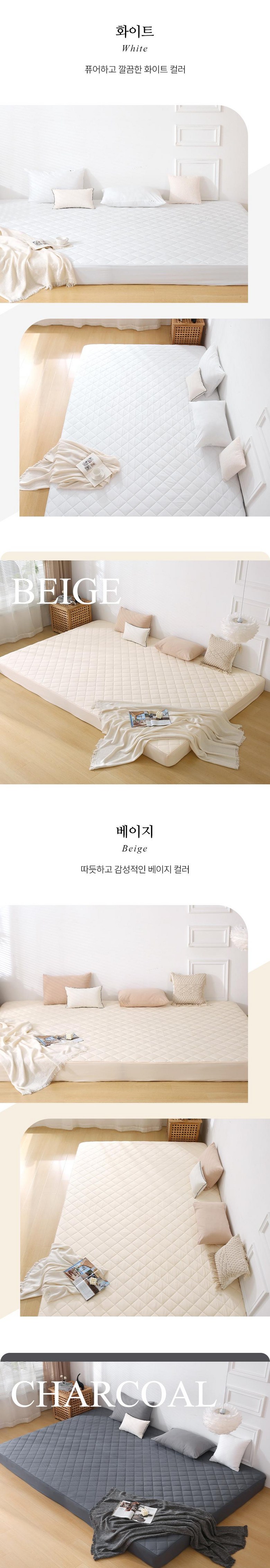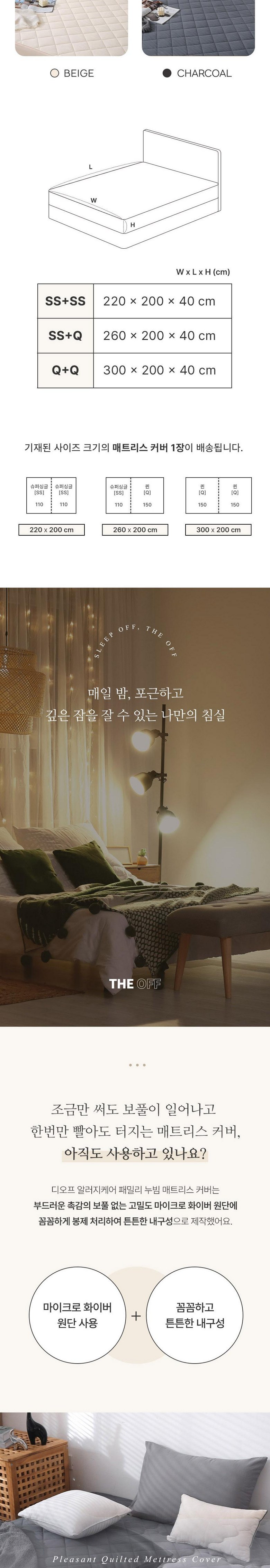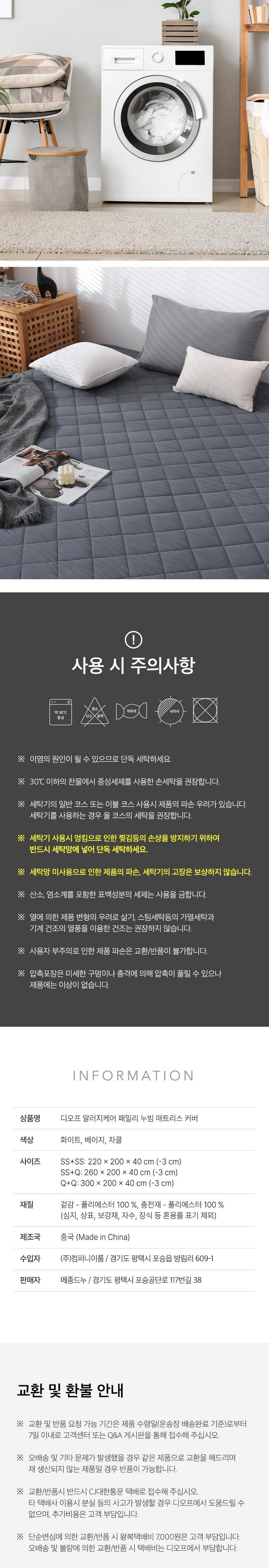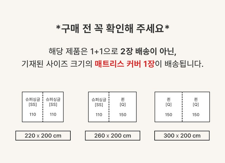 | 치수 | SS+SS 220 x 200 x 40 cm / SS+Q 260 x 200 x 40 cm / Q+Q 300 x 200 x 40 cm | 제품구성 | 매트리스 커버 1장 |