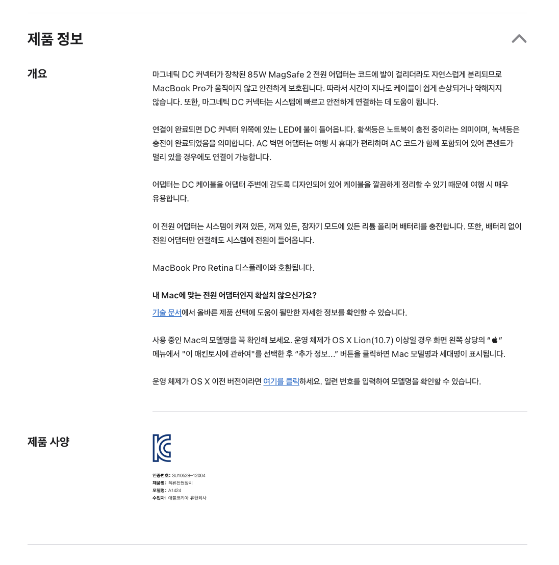 | 품명 및 모델명 | Apple 85W MagSafe 2 파워 어댑터 Power Adapter (MYH83KH/A) / A1424 | KC 인증정보 | SU10528-12004, R-R-PPQ-A1424 |