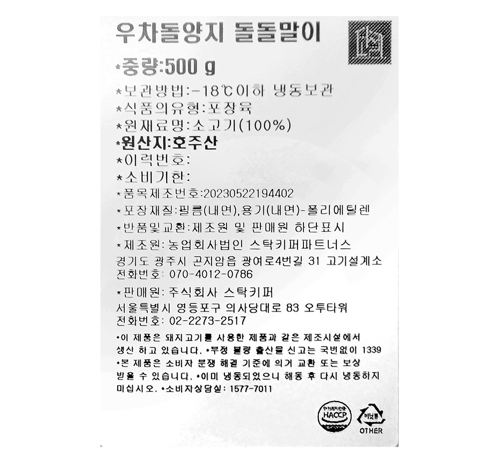 | 제조연월일, 소비기한 또는 품질유지기한 | 소비기한(또는 유통기한) : 2027년 01월 25일 이거나 그 이후인 상품 제조년월일 : 2026년 01월 26일 이후인 제조상품 | 세부 품목군별 표시사항 | 축산물 등급표시 : 해당 없음 / 이력번호 표시유무 : 이력번호 표시제품임 |