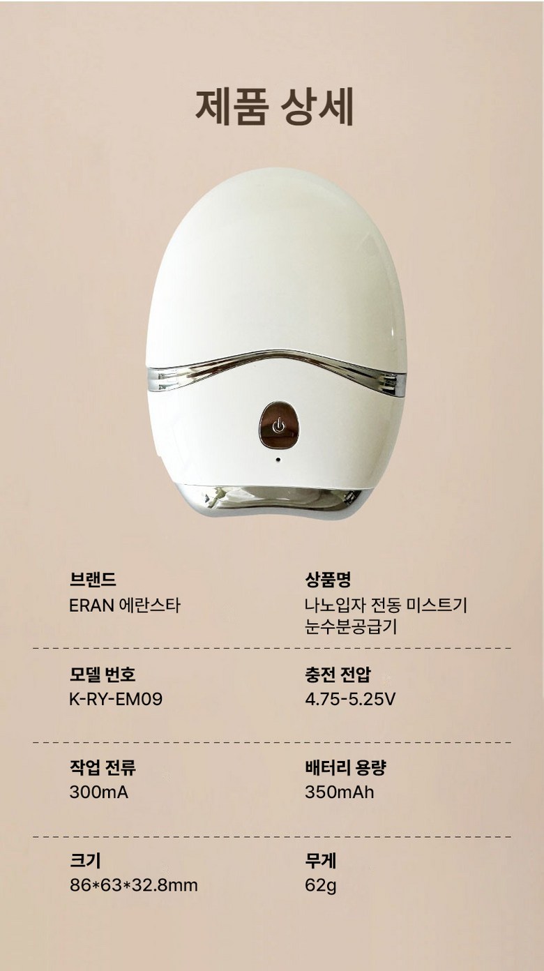 | 품명 및 모델명 | ERAN스타 나노입자 전동 미스트기 눈 수분공급기 | KC 인증정보 | YU101691-22001E |