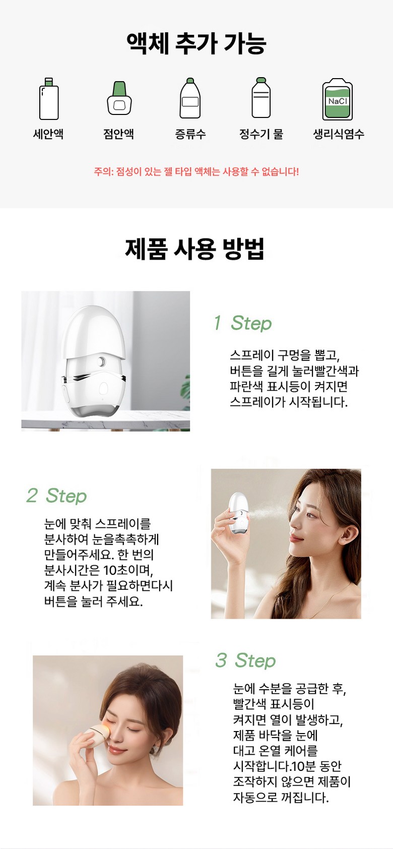 찐득하거나 점성이 있는 액체(예: 토너, 에센스, 오일 등)는 제품 고장의 원인이 됩니다.
