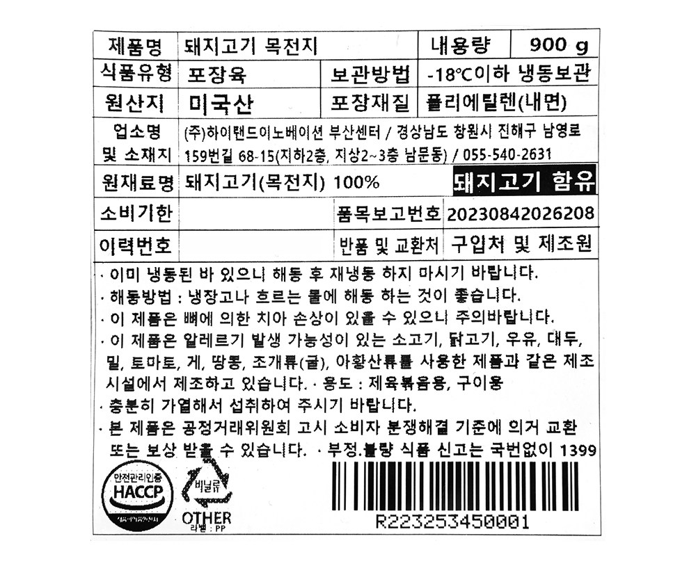 | 제조연월일, 소비기한 또는 품질유지기한 | 소비기한(또는 유통기한) : 2026년 10월 19일 이거나 그 이후인 상품 제조년월일 : 2025년 10월 20일 이후인 제조상품 | 세부 품목군별 표시사항 | 축산물 등급표시 : 해당 없음 / 이력번호 표시유무 : 이력번호 표시제품임 |