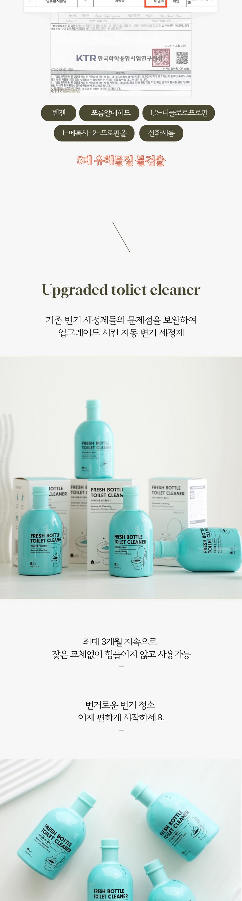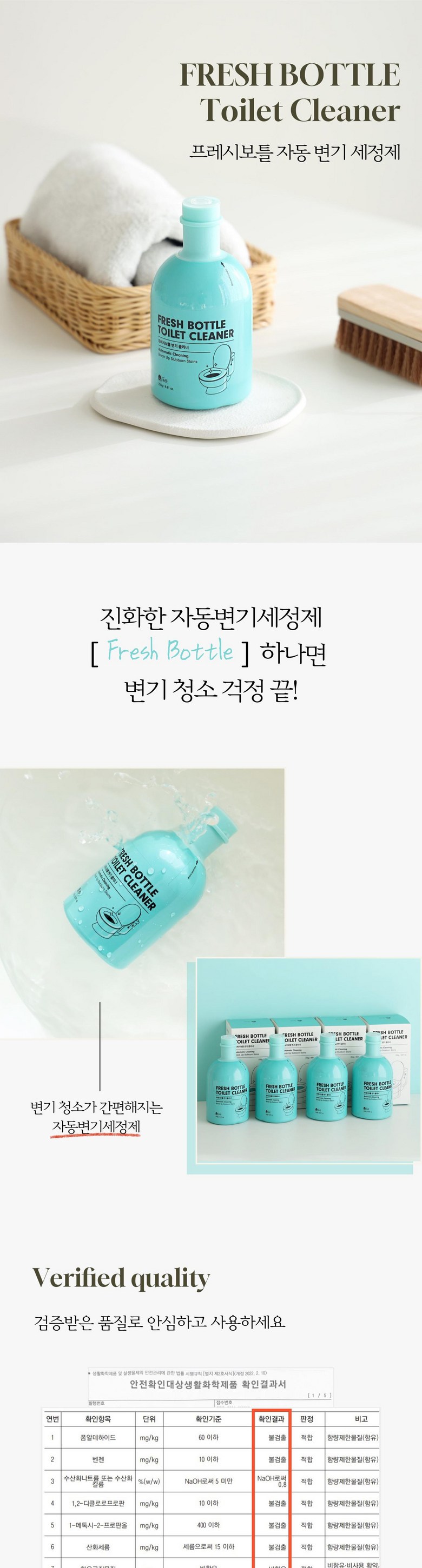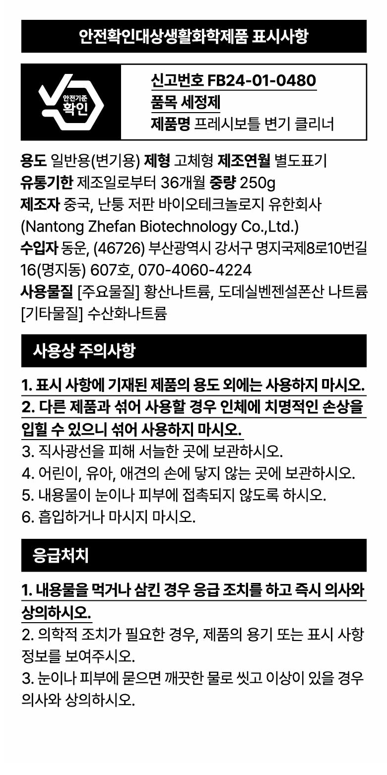 | 품목 및 제품명 | 변기 세정 클리너 | 용도(표백제의 경우 계열을 함께표시) 및 제형 | 일반용(변기용) |