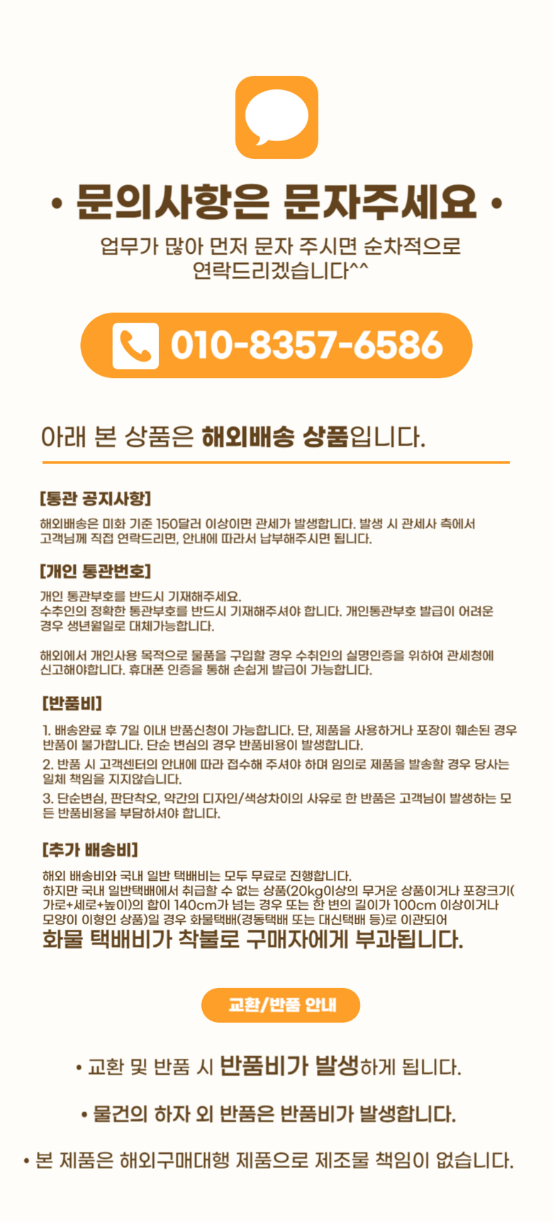 | 교환/반품 비용 (왕복비용) | 150,000원 - 단, 고객 변심의 경우에만 발생 - 도서산간 지역 배송불가 |