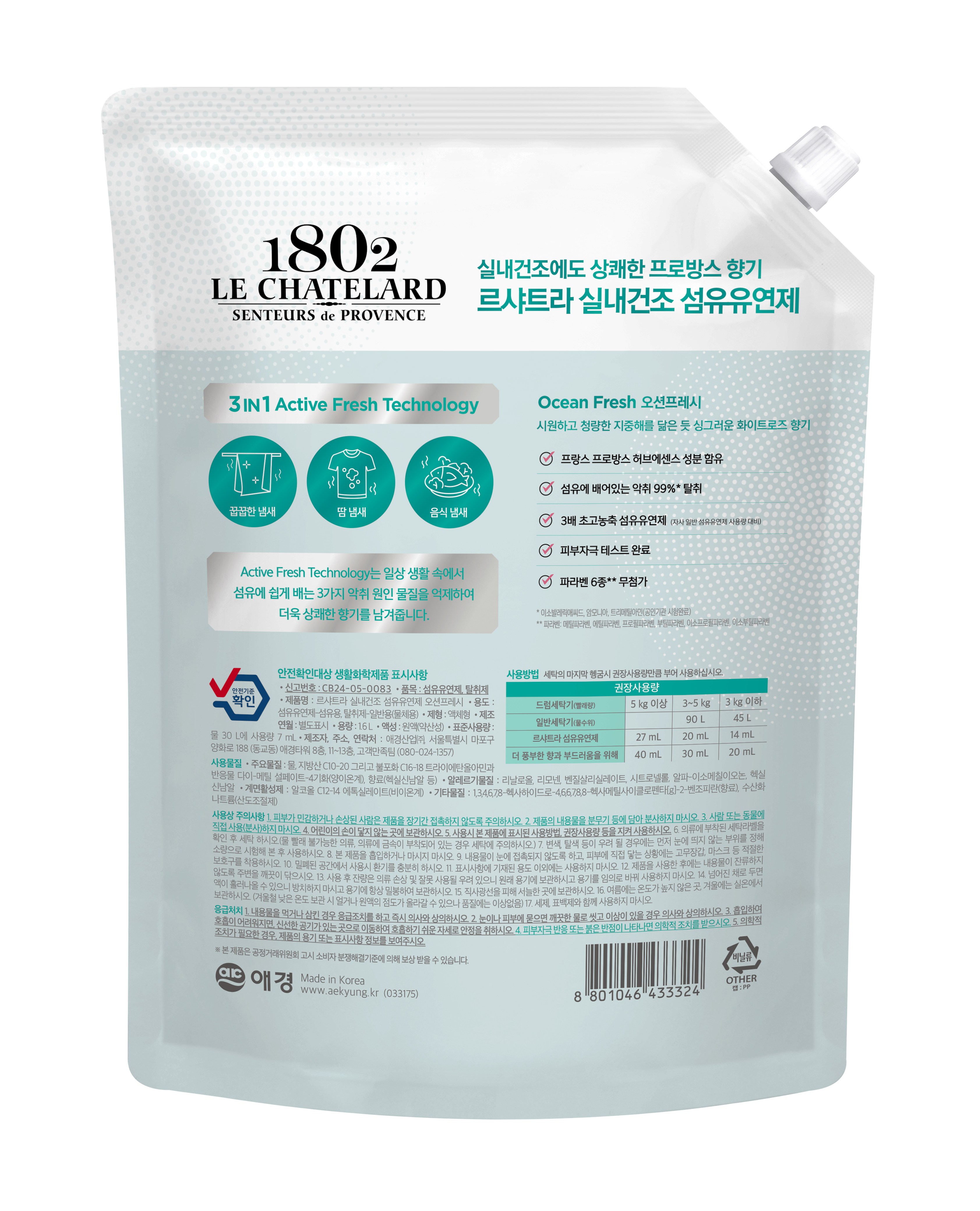 | 품목 및 제품명 | 섬유유연제, 탈취제 / 르샤트라 실내건조 섬유유연제 오션프레시 | 용도(표백제의 경우 계열을 함께표시) 및 제형 | 섬유유연제-섬유용, 탈취제-일반용(물체용) / 액체형 |