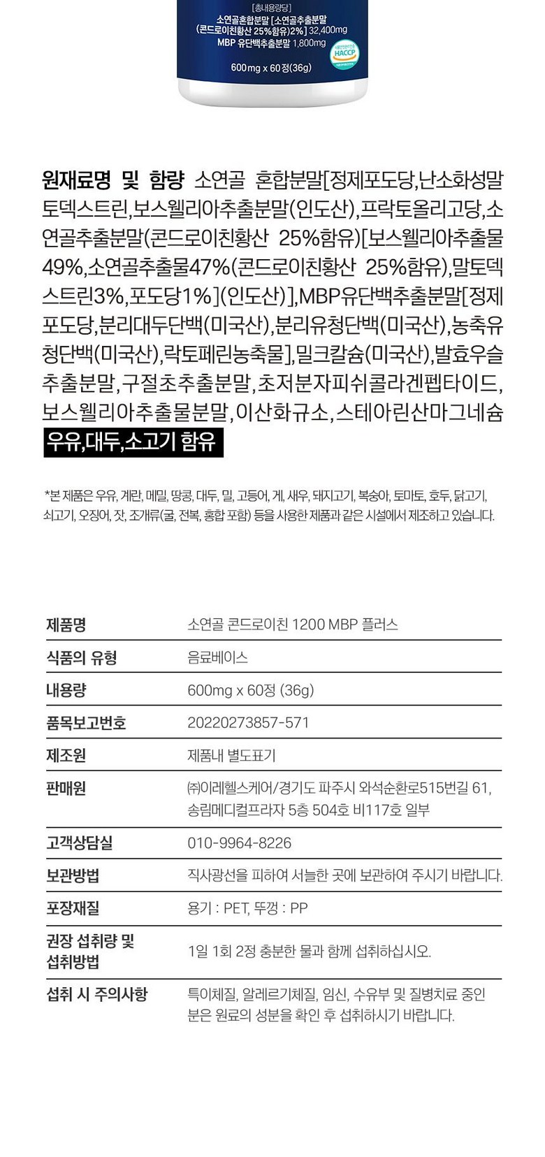 | 원재료명 및 함량 | 소연골 혼합분말[정제포도당,난소화성말토덱스트린,보스웰리아추출분말(인도산),프락토올리고당,소연골추출분말(콘드로이친 황산 25%함유) [보스웰리아 추출물 49%,소연골 추출물47%(콘드로이친황산 25%함유),말토덱스트린3%,포도당1%](인도산)],MBP유단백추출분말[정제포도당,분리대두단백(미국산),분리유청단백(미국산),농축유청단백(미국산),락토페린 농축물], 밀크칼슘(미국산),발효우슬 추출분말,구절초추출분말,초저분자피쉬콜라겐 펩타이드,보스웰리아 추출분말, 초저분자 피쉬콜라겐 펩타이드,보스웰리아추출물분말,이산화규소,스테아린산 마그네슘 우유,대두,소고기 함유 | 영양성분 | 상품상세설명을 참조해주시기 바랍니다. |