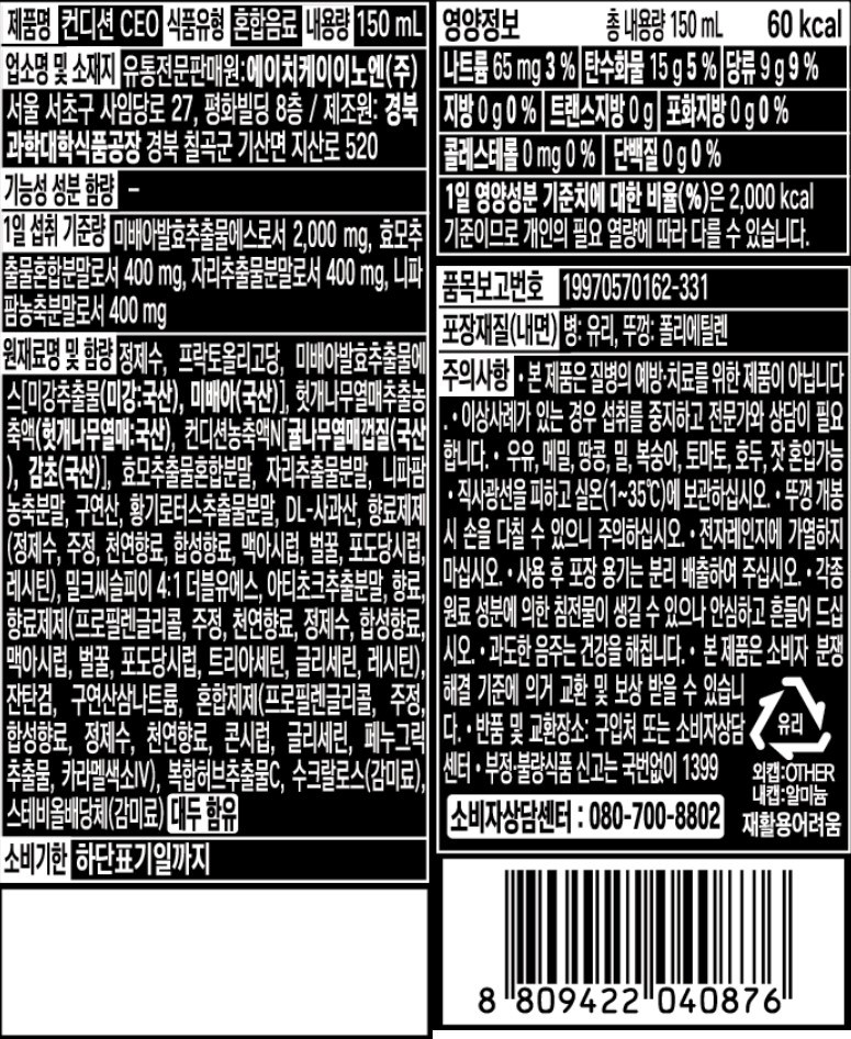 | 포장단위별 내용물의 용량(중량), 수량 | 150ml, 6개 | 원재료명 및 함량 | 컨텐츠 참조 |
