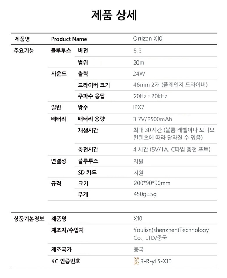 | 품명 및 모델명 | Ortizan X10 | KC 인증정보 | R-R-yLS-X10 |