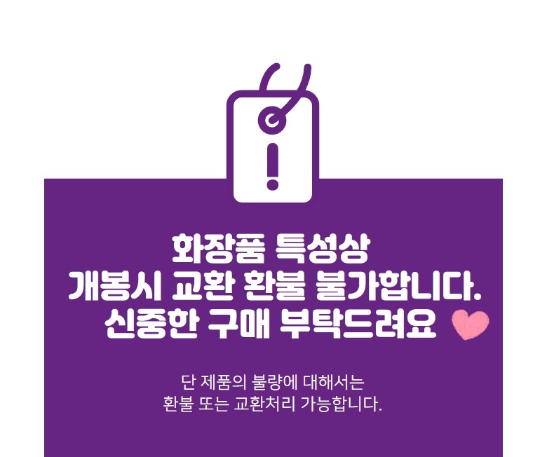 | 교환/반품 신청 기준일 | ㆍ단순변심에 의한 교환/반품은 제품 수령 후 7일 이내까지, 교환/반품 제한사항에 해당하지 않는 경우에만 가능 (배송비용과 교환/반품 비용 왕복배송비 고객부담) ㆍ상품의 내용이 표시·광고의 내용과 다른 경우에는 상품을 수령한 날부터 3개월 이내, 그 사실을 안 날 또는 알 수 있었던 날부터 |