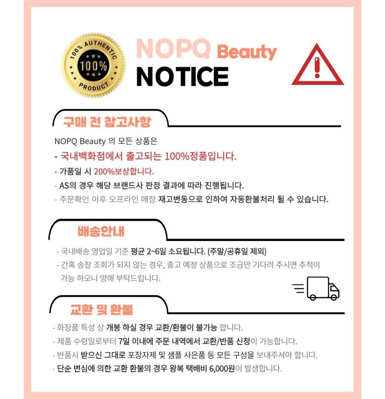 | 교환/반품 비용 (왕복비용) | 6,500원 - 단, 고객 변심의 경우에만 발생 - 도서산간 지역 배송불가 |
