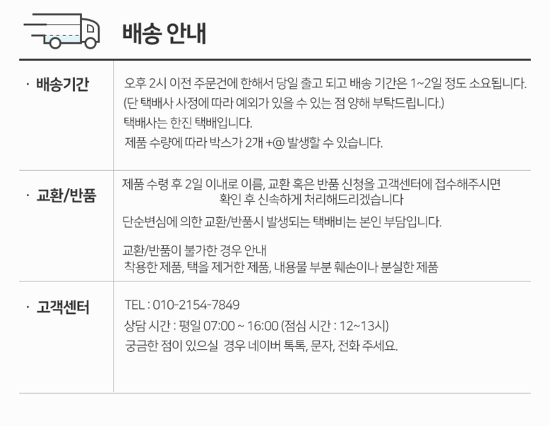 - ㆍ모니터 해상도의 차이로 인해 색상이나 이미지가 실제와 달라, 고객이 단순 변심으로 교환/반품을 무료로 요청하는 경우