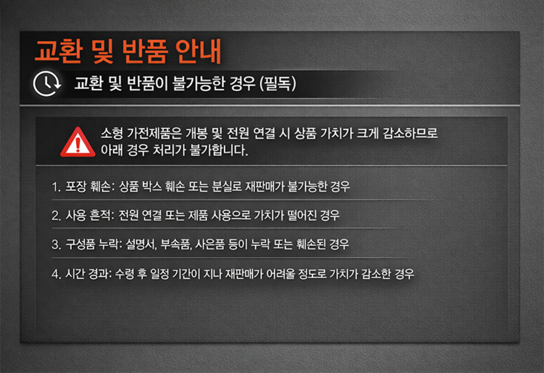- ㆍ교환/반품에 관한 일반적인 사항은 판매자가 제시사항보다 관계법령이 우선합니다.
