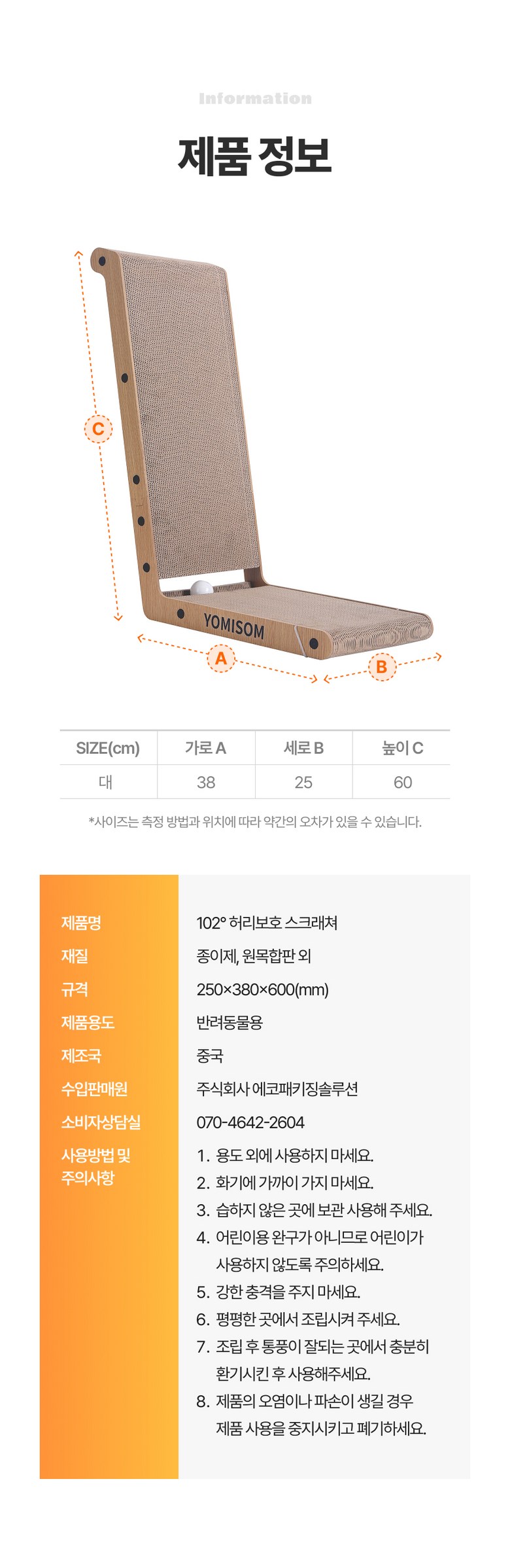 | 품명 및 모델명 | 102도 허리보호 스크래쳐 | 인증/허가 사항 | 해당사항없음 |