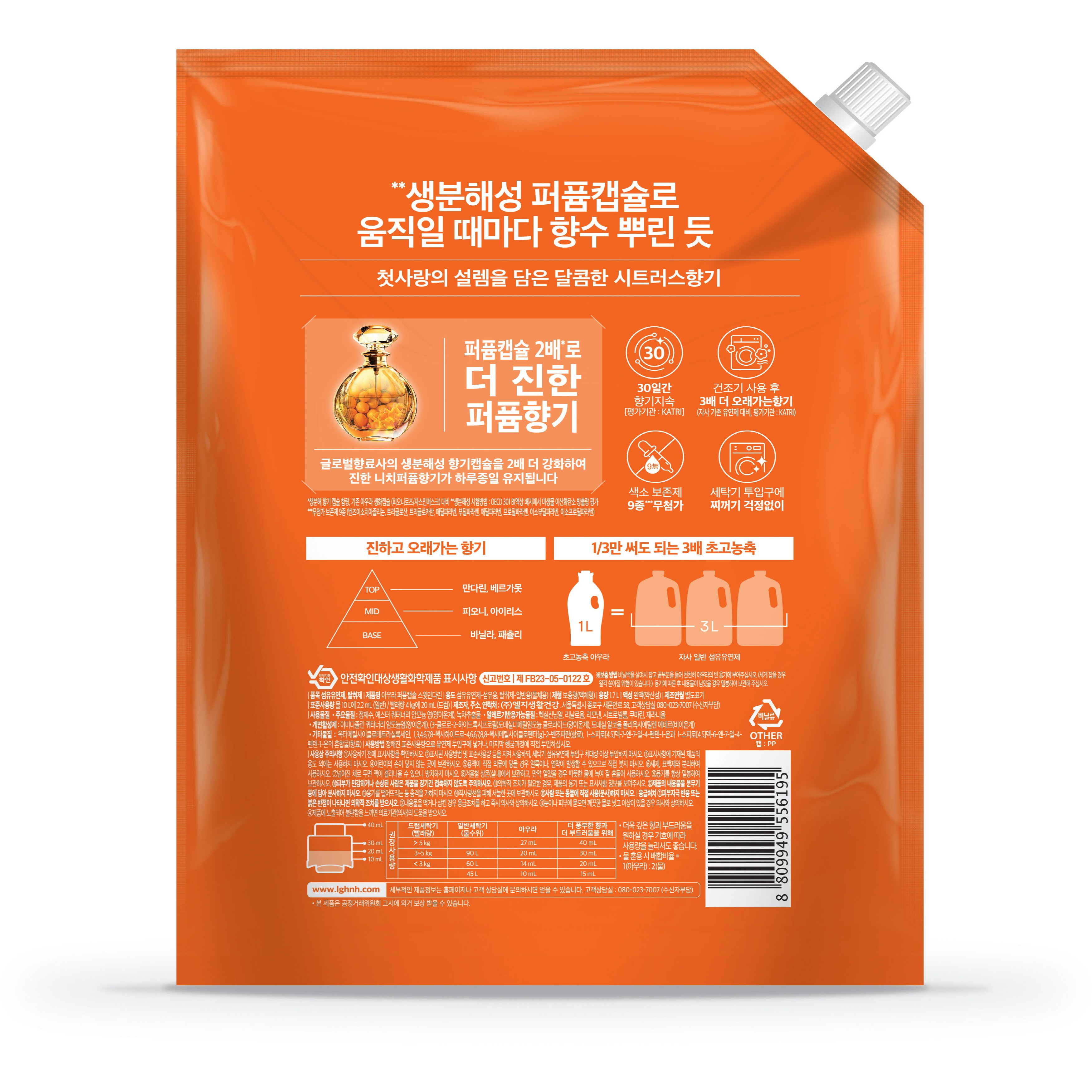 | 품목 및 제품명 | 섬유유연제,탈취제 / 아우라 퍼퓸캡슐 스윗만다린 | 용도(표백제의 경우 계열을 함께표시) 및 제형 | 섬유유연제:섬유용, 탈취제:일반용(물체용) / 보충형(액체형) |